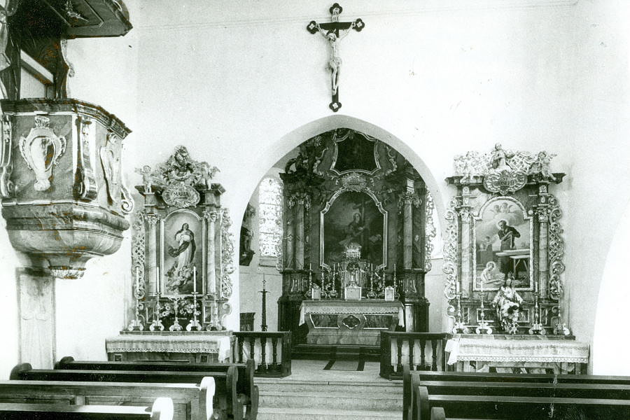 mit leicht nach vorne geneigter Bodenfläche, bildete die Konsekration durch Weihbischof Karl Flügel am 21. Juli 1979. Er bezeichnete den Bau als eine "glückliche Verbindung des Alten mit dem Neuen".