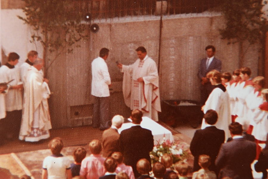 Alte Kirche und Grundsteinlegung zum Erweiterungsbau 1977